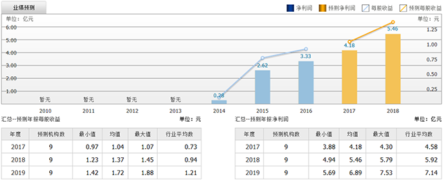 截至2017年7月17日,6个月以内共有 9 家机构对华大基因的2017年度业绩作出预测;预测2017年每股收益 1.04 元,较去年同比增长 13.04%,预测2017年净利润 4.18 亿元,较去年同比增长 25.53%。