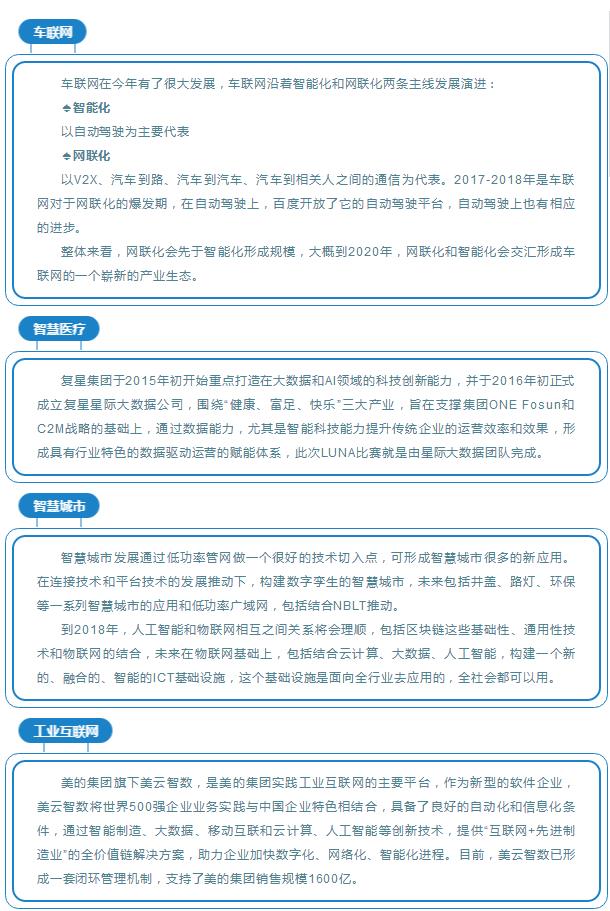 2017年行业发展的突出领域集中在新零售、共享经济和智能家居三个行业。物联网技术贯穿在新零售整个发展过程中,包括从入门的识别、对物体采购时的移动、最后的结账以及人脸识别都是物联网技术和新零售的结合,从线上走向线下,来解决它的技术性问题;
