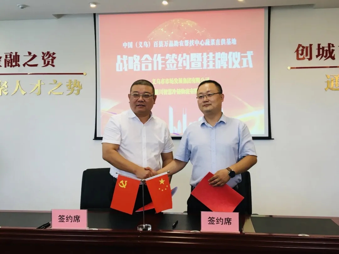签约仪式上,银川智慧冷链物流有限公司总经理助理杨清兵从直采基地、食品检测、生鲜电商、物流配送、智慧冷储等方面全面介绍了冷链物流示范工程的情况;义乌市市场发展集团有限公司副总经理、“百县万品”消费扶贫筹备组组长赵志刚详细介绍了公司在义乌市商贸流通、电商直播方面的优势资源及农副产品市场群的业务开展情况。随后在自治区人民政府驻浙江办事处、驻上海办事处、浙中农副产品物流中心、义乌绿禾电子商务有限公司、义乌市陶惠科技有限公司、宁夏绿禾购供应链管理有限公司和宁夏鲜丰农业开发有限公司的共同见证下,银川智慧冷链物流有限公司与义乌市市场发展集团有限公司签署了战略合作协议,并为“中国(义乌)百县万品助农帮扶中心蔬菜直供基地”揭牌。
