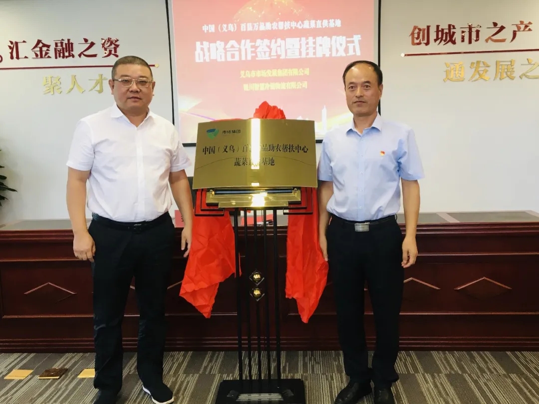 8月12日,银川汇创资本投资控股有限公司子公司银川智慧冷链物流有限公司与义乌市市场发展集团有限公司战略合作签约暨“中国(义乌)百县万品助农帮扶中心蔬菜直供基地”揭牌仪式在汇创资本隆重举行。汇创资本党支部书记、副总经理别志立,义乌市市场发展集团有限公司副总经理赵志刚、黄胜,银川智慧冷链物流有限公司总经理盛军出席了仪式,自治区人民政府驻浙江办事处、驻上海办事处及有关企业的负责人共同参加。