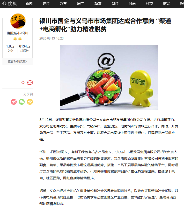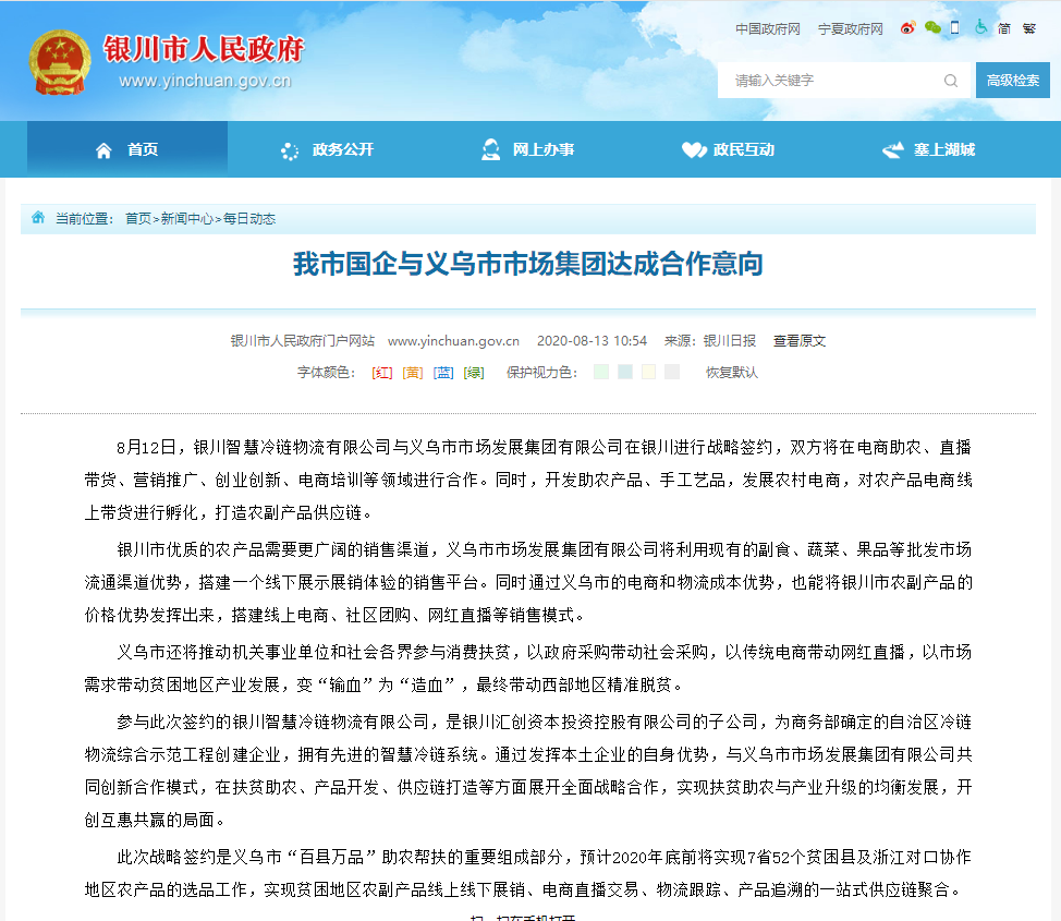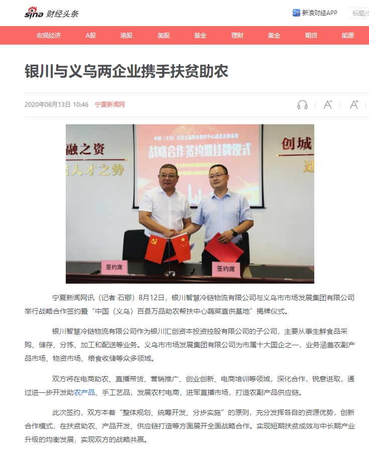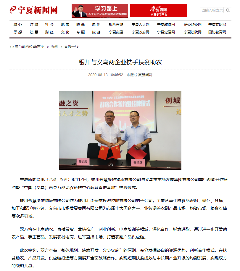 银川智慧冷链物流有限公司作为汇创资本的子公司,主要从事生鲜食品的采购、储存、分拣、加工和配送等业务,一直以来致力于通过“安全采购+网络平台+冷链配送+线下实体+线上服务”的全产业链服务模式,打造设施先进、上下游衔接、功能完善、标准健全的农产品冷链物流服务体系。此次战略签约是义乌市“百县万品”助农帮扶的重要组成部分,更是银川智慧冷链物流有限公司进军直播市场助农帮扶、推进农产品供应链体系建设、提升农副产品服务水平的重要举措,双方的合作对助力打赢脱贫攻坚战,实现短期扶贫成效与中长期产业升级的均衡发展具有重要意义,受到了媒体的争相报道和社会各界的广泛关注,宁夏广播电视台、宁夏新闻网、银川日报、银川晚报等区内主要媒体对签约仪式进行了报道,搜狐网、新浪网等媒体第一时间进行了转载,银川市人民政府等单位官方网站也对相关情况进行了广泛宣传和推广。