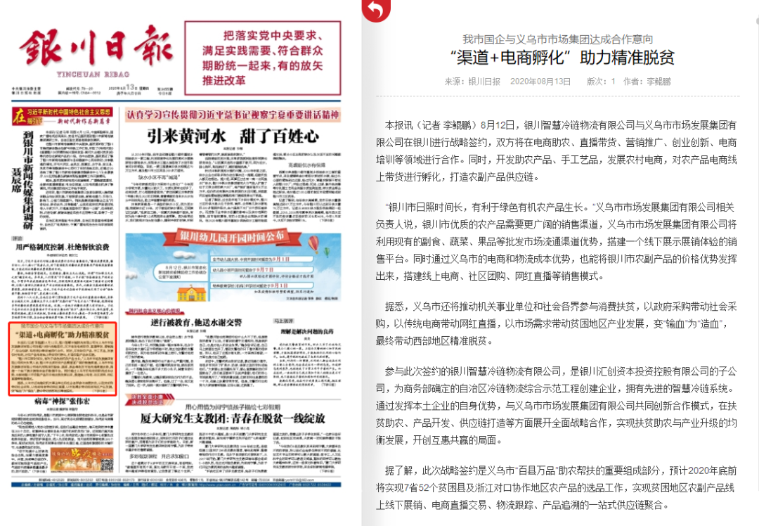 根据战略合作协议,银川智慧冷链物流有限公司与义乌市市场发展集团有限公司,将深入贯彻落实习近平总书记关于扶贫工作的重要指示精神,本着“整体规划、统筹开发、分步实施”的原则,以促进本地农副产品销售、帮助农民稳定致富、协助周边建档立卡贫困户增收为目标,在电商助农、直播带货、营销推广、创业创新、电商培训等领域,开展创新化、多渠道、深层次、多形式的合作与交流。一是在扶贫助农方面展开深入合作,充分利用宁夏优质资源,依托“百县万品”助农帮扶中心,积极挖掘宁夏特色农副产品及手工艺品,打造农副产品供应链,帮助农民增收;二是在销售渠道方面创新合作模式,通过培育农村电商、直播电商、营销推广、运营管理等专业人才,进军直播市场,共同孵化农产品网红品牌,有效拓宽宁夏本地农产品外销渠道,在实现合作共赢的同时,共同助力打赢脱贫攻坚战。
