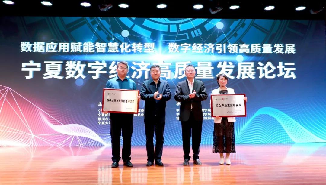 9月18日,由自治区发改委、工信厅、银川市人民政府、宁夏大学主办,宁夏大学经济管理学院、信息工程学院,银川汇创资本投资控股有限公司承办的宁夏数字经济高质量发展论坛在宁夏大学国际交流中心隆重举行,国内研究机构、自治区相关部门、银川市属相关部门、产业园区、宁夏大学相关院系、金融机构以及知名企业等代表共计300余人参加了论坛。当天银川市委常委、人民政府副市长陈康仁,宁夏大学党委常委、副校长李建设为银川汇创资本投资控股有限公司和宁夏大学数字经济与智慧管理研究院联合成立的“校企产业发展研究院”揭牌,同时宁夏大学经管学院为银川汇创资本投资控股有限公司“产学研合作共建基地”授牌。