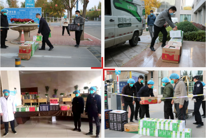一线冲锋抗疫情,后方慰问暖人心,公司在做好疫情防控工作部署、舆情宣传、每日消杀等疫情防控工作的同时,时刻心系抗疫一线工作人员,主动作为,竭尽所能,积极组织旗下银川智慧冷链物流有限公司,充分发挥供应商资源优势,迅速采购了水果、牛奶等生活保障物资,第一时间送到宁夏税务干部学校、昊王国际饭店、银川金宇伊豪宾馆和尚客优快捷酒店等集中隔离点,为奋战在抗疫一线的工作人员送去了关心和温暖,排除他们的后顾之忧,以实际行动为打赢疫情防控阻击战贡献汇创力量。