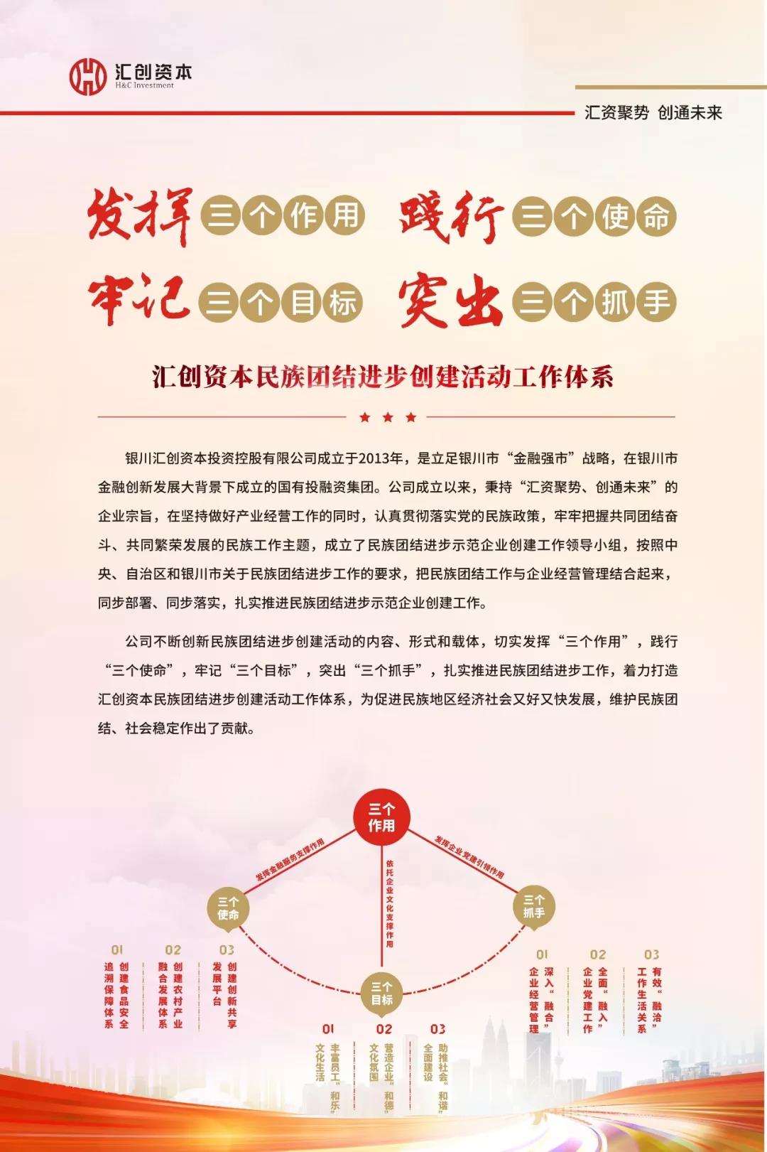 汇创资本作为国有投融资集团,在坚持做好产业经营工作的同时,认真贯彻落实党的民族政策,牢牢把握共同团结奋斗、共同繁荣发展的民族工作主题,按照中央、自治区和银川市关于民族团结进步工作的要求,把民族团结工作与企业经营管理结合起来,不断创新民族团结进步创建活动的内容、形式和载体,切实发挥“三个作用”,践行“三个使命”,牢记“三个目标”,突出“三个抓手”,扎实推进民族团结进步工作,着力打造汇创资本民族团结进步创建活动工作体系,为促进民族地区经济社会又好又快发展,维护民族团结、社会稳定,为建设团结和谐、繁荣发展的宁夏作出了贡献。