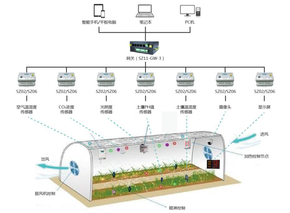 以生态温室为例,随着远程监控系统、无线传感器监测等技术日趋成熟,物联网、大数据等技术已逐步应用到了生态农业建设中。通过环境、动植物信息检测,温室农业大棚信息检测和标准化生产监控,精准农业中的节水灌溉等应用模式,提高了农业生产的管理效率、提升了农产品的附加值、加快了智慧农业的建设步伐。其主要方式通过安装于指定的监测点的空气温湿度传感器、土壤温湿度传感器、土壤PH传感器、光合有效辐射传感器、CO2传感器等设备实时监测空气的温湿度、二氧化碳浓度、土壤温湿度及PH值等相关数据;联动控制系统由加热、喷灌、通风、卷帘设备及其配套PLC及Wifi设备服务器组成,当传感器采集的环境数据与标准值对比超出临界范围时,控制器自动启动相关硬件设备对作物生长环境加热、浇水、通风、卷帘加减光照辐射,实现作物生长过程精确控制。同时在塑膜日光温室旁,建立地下沼气池,沼气池上方建圈舍及厕所,形成一个封闭的智慧化能源生态系统。在此系统内,圈舍温度在冬天提高3~5℃,为禽畜提供了更适宜的生长条件,使猪的生长期大幅缩短约150天。禽畜粪便为沼气池提供原料,产出的沼气用于家庭供暖,残留的沼渣、沼液作为温室作物的肥料。此外,猪等禽畜呼吸排出的CO2可促进温室内作物光合作用,蔬菜产量和质量明显提高。