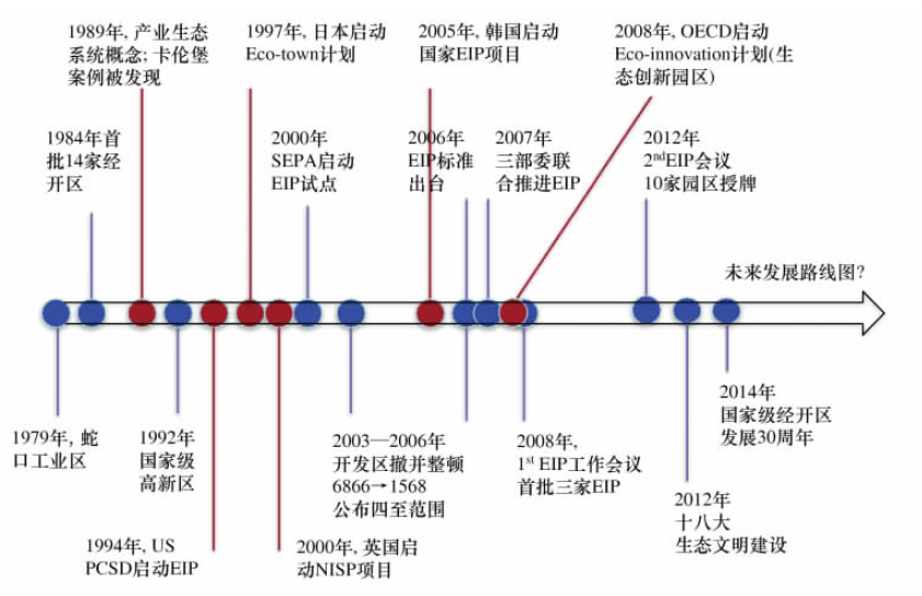 生态工业园区是产业生态学研究和实践的重要载体之一。工业园区这一人工经济系统在发展中有意识地模仿自然生态系统,应用系统工程的理论和方法,对现有园区进行重新规划、设计和建设,以提高资源、能源利用效率,减少污染物产生和排放,改善环境质量,促进经济持续发展。2000年以来,欧美国家、澳大利亚、日本、韩国、新加坡、印度、巴西等国家都出现了一系列关于生态工业园区案例的实证分析。工业发达国家生态工业园区发展的代表性例子包括丹麦、美国、英国、日本和韩国,下图为几个主要国家及中国推进生态工业园区发展的演变概览。发达国家现阶段关于生态工业园区发展的重点问题主要集中在以下方面:(1)生态化发展的驱动力,包括园区建立物质、能量、信息、废弃物等集成系统过程中潜在干系方之间建立合作联系的驱动力;(2)生态化发展准则,目的是定义并识别推动生态化发展的创新行动(3)生态化发展成功要素,目的是从政治、经济、社会和环境识别各园区生态创新的成功要素;(4)定义针对推动园区生态创新有效发展和管理的关键问题。