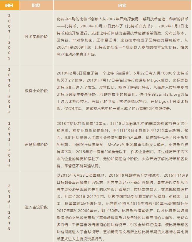 区块链是由一系列技术实现的全新去中心化经济组织模式,2009年诞生于比特币系统的构建,2017年成为全球经济热点,但区块链的成功应用寥寥,这个新兴产业还远未成熟。其发展大体可划分为六个阶段。