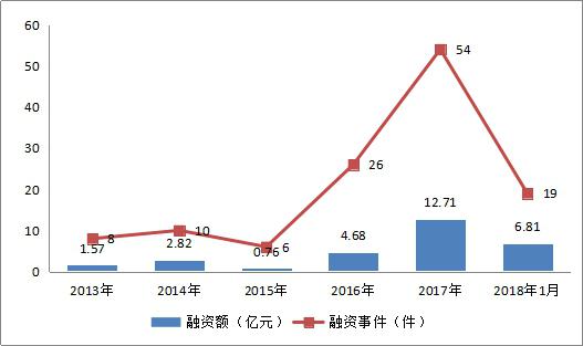 区块链项目融资从2013年至2016年呈小幅上涨趋势。由于2015年的政策监管,导致2015年区块链的投资热度有所下降,在2017年VC大举入局,投资额达12亿。2018年1月,区块链行业融资额和融资事件已经超过2016年。
