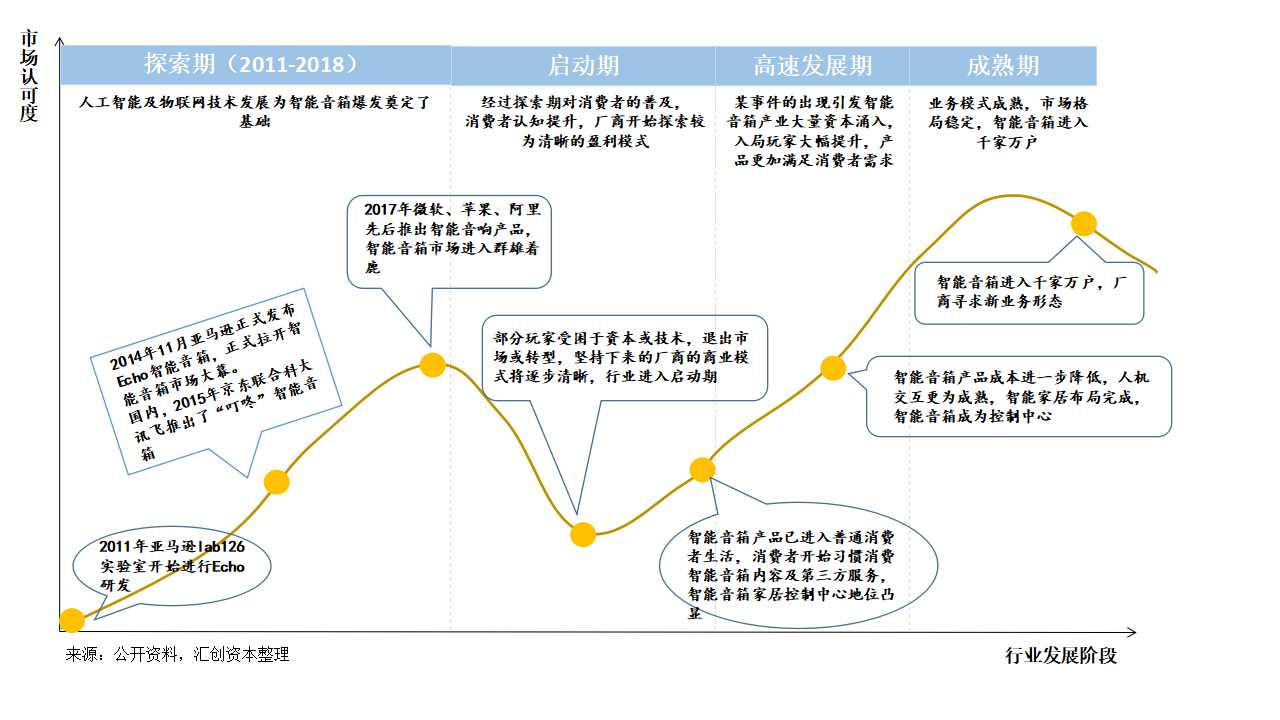 4.成熟期。此阶段内,智能音箱业务模式成熟,市场格局稳定,智能音箱进入千家万户。