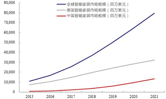 近年来智能家居市场进入快速拓展期,用户渗透率快速增长。根据调查数据显示,2017 年美国智能家居市场规模将达 146 亿美元,渗透率提升至 32.5%,预计 2021 年将达到 60.7%。而中国智能家居市场规模也超过 20 亿美元, 渗透率为 2.6%,与美国相比差距较大,未来发展空间广阔。随着语音识别技术不 断成熟,智能音箱作为语音交互载体,在控制智能家居的便捷度和体验上都将逐 步优于智能手机。未来智能音箱有望成为智能家居的控制中枢,成为一个开放性的平台,可以让客厅的智能电视、电灯、空调等链接起来,通过语音交互来实现对于其他智能家居产品的控制,掌握了智能音箱便掌握了智能家居的入口。