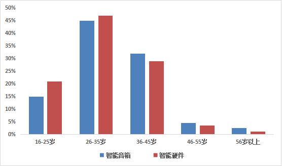 从上述图表中可以看出,智能音箱用户主要集中在26-45岁人群,其中36-45岁人群占比高于智能硬件用户。