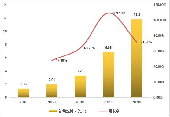 根据艾媒咨询数据显示,2016年中国智能音箱销售规模为1.36亿元,预计2017年将突破两亿,达到2.01亿,增长率为47.8%;预计到2020年,智能音箱销售规模将超过10亿元。目前虽众多厂商已推出智能音箱产品,但市场总体销售规模仍处于较低水平,随着产品进一步优化升级及智能家居的推广,中国智能音箱消费市场潜力将得到释放,行业有望迎来爆发式增长。