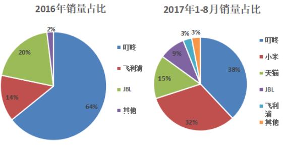 2016年整体智能音箱呈京东叮咚垄断的趋势,占比高达65%,飞利浦与JBL占比分别为14%、20%。2017年随着更多厂商加入到智能音箱的市场,整体市场格局发生了改变,叮咚的市场份额降到38%,小米紧追其后,占比32%。
