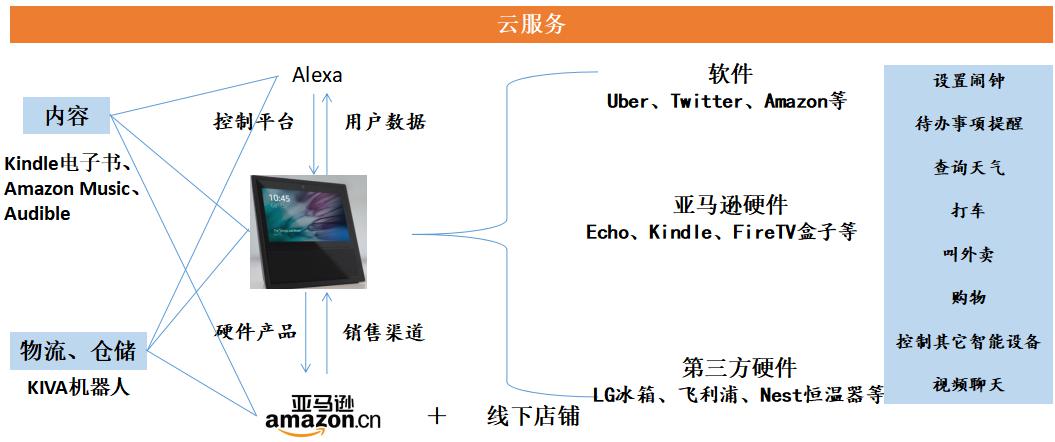 2.亚马逊具有深厚的电商基础,并在内容、硬件、平台、云计算、物流仓储等领域布局,通过智能音箱整合软件+硬件+平台+内容资源,进一步盘活电商资源。