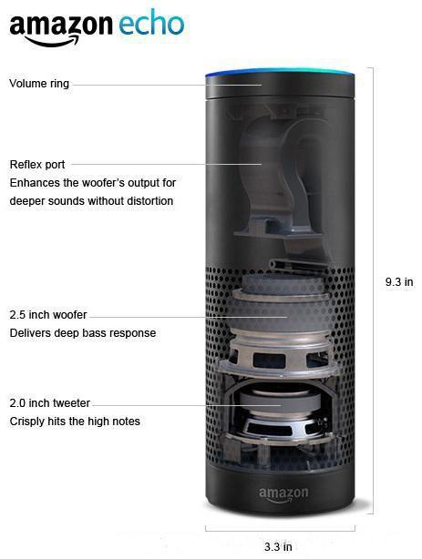 以Echo音箱为例,Echo采用封闭式扬声器设计,高音和低音喇叭上下相对,声音各个方向是对称的,这有利于前端信号处理,但音效会受到限制。
