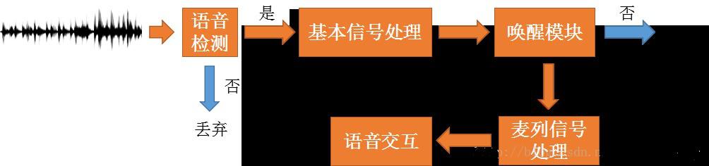 总体而言,音箱工作时,麦列始终处于拾音状态(持续对声音信号进行采样、量化)。经过基本的信号处理(静音检测、降噪等),唤醒模块会判断是否出现唤醒词。如果出现唤醒词,后续语音会进行更复杂的语音信号处理,(理想情况下)得到干净的语音信号,开始真正的语音交互流程。