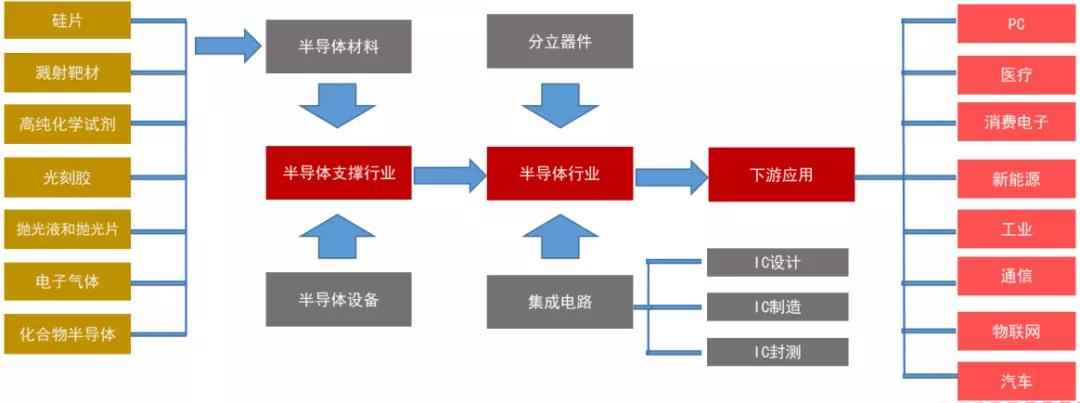 半导体行业具有技术难度高、投资规模大、产业链环节长、产品种类多、更新迭代快、下游应用广泛的特点,产业链呈垂直化分工格局。半导体制造产业链包含设计、制造和封装测试环节,半导体材料和设备属于芯片制造、封测的支撑性行业,位于产业链最上游。