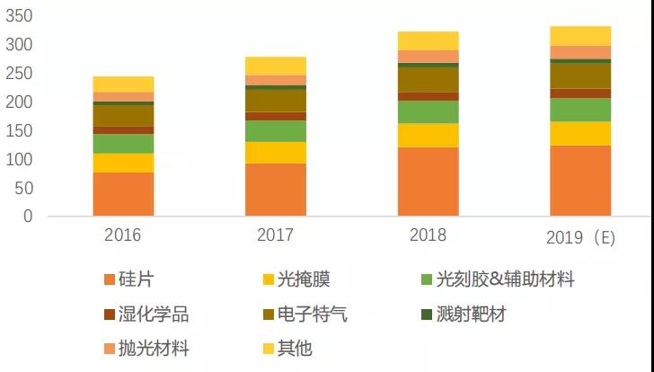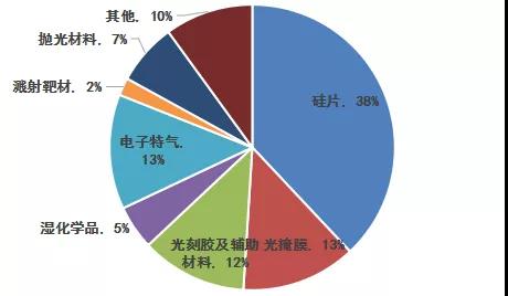 根据 SEMI 统计,2018年全球半导体材料市场为322.3亿美元,其中硅片、光掩膜、光刻胶和光刻胶辅助材料、湿化学品、电子特气、溅射靶材、CMP抛光材料市场分别为121.2、40.4、39.6、16.1、42.7、8、21.7亿美元,其中以硅片市场最大,市场占比最高;2018年硅片、光掩膜、光刻胶和光刻胶辅助材料、湿化学品、电子特气、溅射靶材、抛光材料的市场增速分别为31%,7.7%,6.7%,6.6%,10.3%,6.7%,17.3%,均实现了较高幅度增长。
