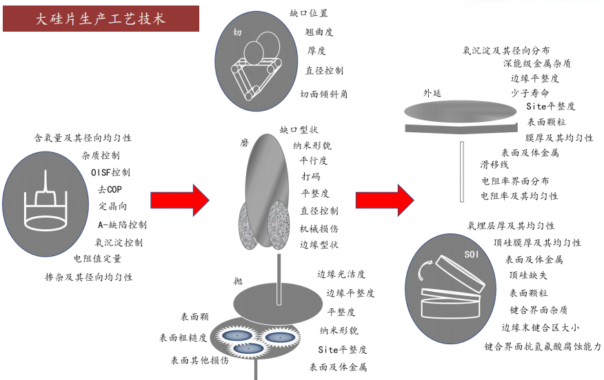 ②硅片产品按照加工工序可分为抛光片、退火片、外延片、节隔离片和绝缘体上硅片五大类产品。