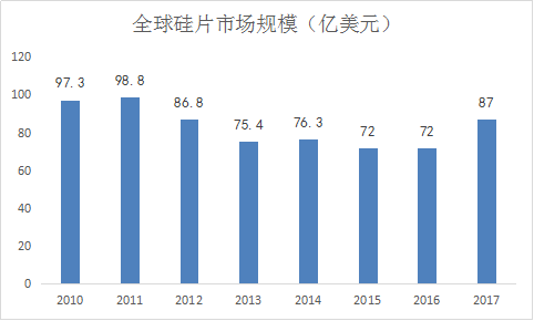 根据SEMI统计数据,全球半导体硅片市场规模在2009年受经济危机影响而急剧下滑,2010年大幅反弹。2011年到2013年销售额连续两年下降,主要系300毫米大硅片的普及造成硅片单位面积的制造成本下降同时加上企业扩能竞争激烈,2013年全球硅片的市场规模只有75亿美金。2014年受汽车电子及智能终端的需求带动,12寸大硅片价格止跌反弹,全球硅片出货量与市场规模开始复苏。受益于半导体行业及晶圆产能增长,2016年来,全球硅片出货量和价格持续上行。2016-2018 年,全球半导体硅片销售金额从72.09亿美元增长至113.81亿美元,根据Gartner的预测,到2020年全球硅片市场规模将达到110亿美元左右。