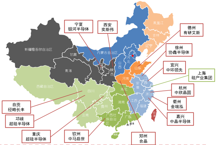 现阶段来看,国内硅片在建或规划产能较高。目前国内用于新建硅片厂商的投资金额超过1500亿元,硅产业、超硅半导体、有研半导体、金瑞泓、中环半导体、中芯晶圆、宁夏银和等公司均开始兴建或计划建设硅片加工厂。根据华夏幸福研究院统计结果,假若目前新建或规划硅片产能完全投产,预计8英寸硅片产量可达406万片/月,12英寸硅片产量可达665万片/月。
