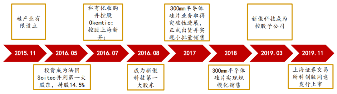 上海硅产业主要从事半导体硅片的研发、生产和销售,主要产品是300mm及以下的半导体硅片,是中国大陆规模最大的半导体硅片制造企业之一,率先实现300mm半导体硅片规模化销售,打破了我国300mm半导体硅片国产化率几乎为0的局面,推进了我国半导体关键材料生产技术‚自主可控的进程。下游应用于半导体行业,是生产集成电路、分立器件等半导体产品的关键材料,具体应用于存储芯片、传感器芯片、射频芯片、逻辑芯片、模拟芯片、分立器件、功率器件等中。