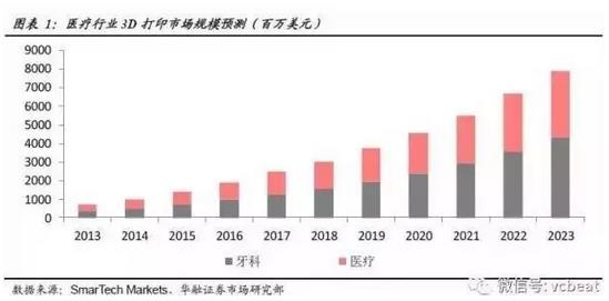 根据SmarTech《牙科3D打印2015:一个十年的机会预测与分析》中的预测,3D打印技术在牙科领域的市场规模到2016年会达到20亿美元,2020年销售规模可上升至31亿美元。