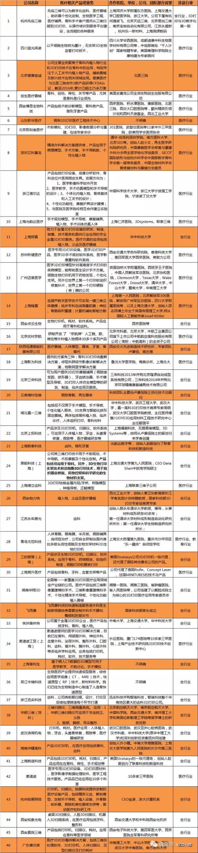 在做这个选题之前,本以为国内的相关企业会很少,可是此次盘点动脉网一共找到46家与3D医疗打印相关的企业(由于时间和信息量的关系,相信我们收集的数据并不全面,未收录到的企业和机构请与我们联系)。