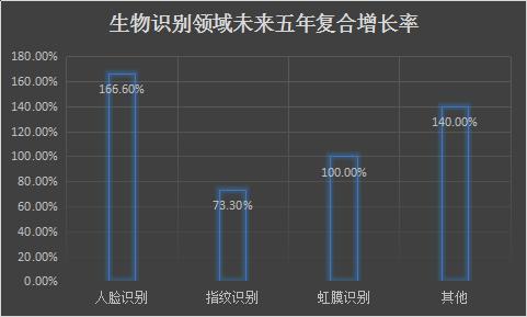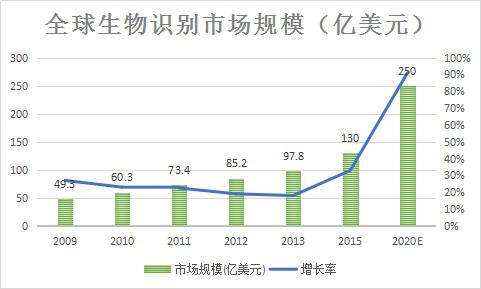 根据国内知名机构测算,人脸识别主要应用领域市场规模,公安领域16亿以上、交通领域50亿以上、金融和教育领域分别百亿级别。据前瞻网等数据显示(如图1、2),全球生物识别市场规模预计在2020年达到250亿美元,人脸识别未来五年复合增长率预计达166.60%,人脸识别作为人工智能模式识别中应用领域最为广泛的细分行业,伴随安防、交通等新增市场的打开,预计整体市场规模有望呈现爆发式增长。