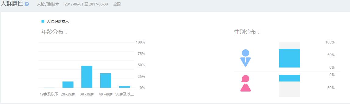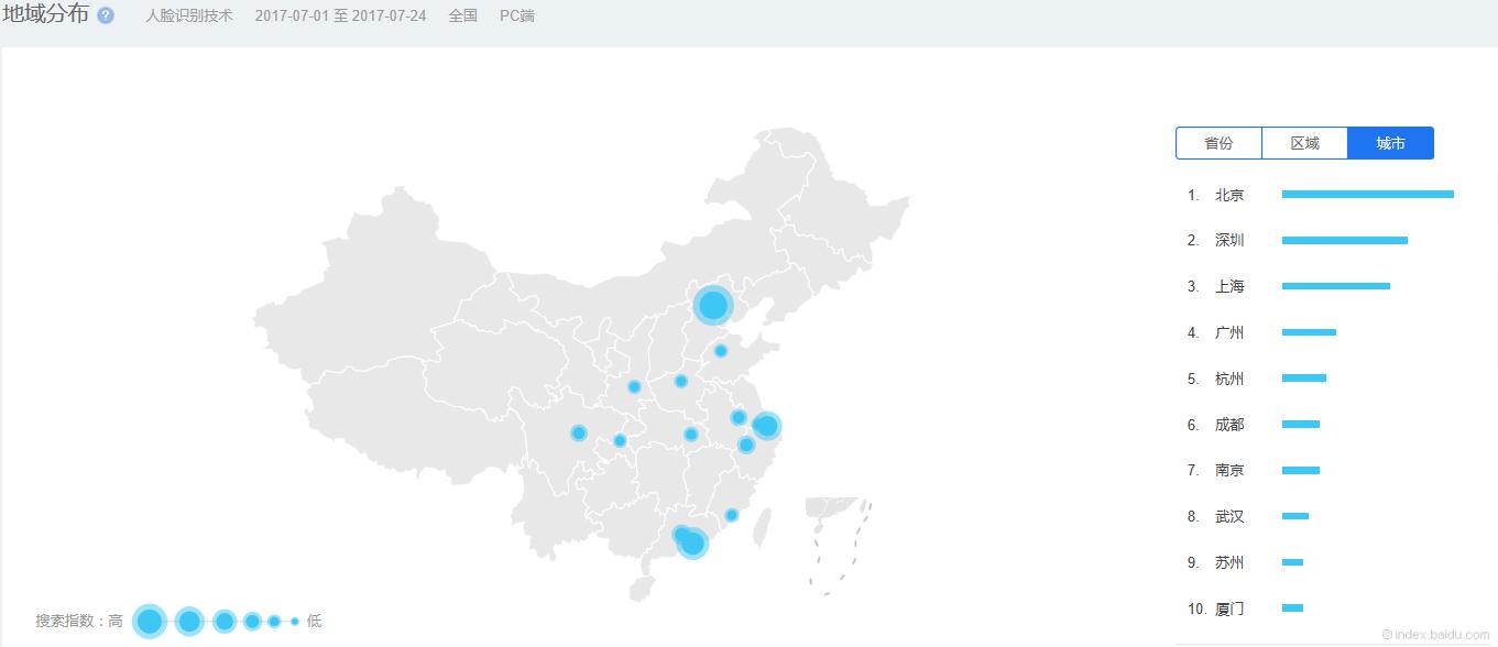 根据百度数据显示,市场对于人脸识别技术的关注度,根据地域分布,主要集中在北京、深圳、上海、广州、杭州等城市;根据年龄和性别分布,主要集中在男性青年群体。