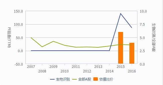 在2014年以前,人脸识别技术所属的生物识别行业市盈率PE低于全部A股PE,其值在0附近;2014年至2016年,生物识别行业PE高于全部A股均值,并在2015年接近150%,被市场看好。