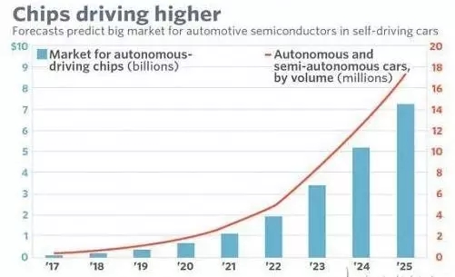 以无人驾驶汽车的智能化趋势为例,摩根大通估计到2025年,用于无人驾驶汽车的半导体器件销售额可达73亿美元,从2017年到2025年的年复合增长率高达62.5%。2015年全球汽车半导体总销售额不过300亿美元,摩根估计平均每部车用到的芯片价值将从现在的300至400美元增长到2025年400至500美元。
