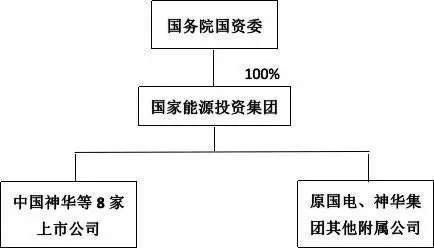 在神华集团与国电集团吸收合并前,国务院国资委分别持有国电集团、神华集团100%股权。吸收合并完成之后,国务院国资委持有国家能源投资集团100%股权。如图所示: