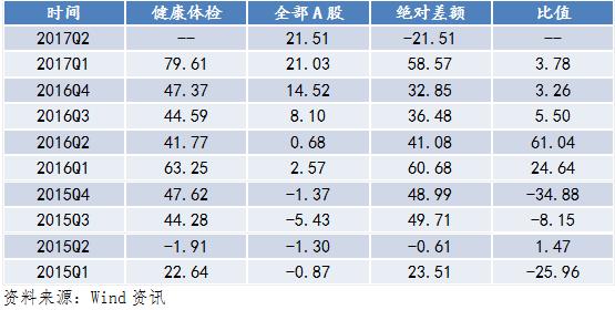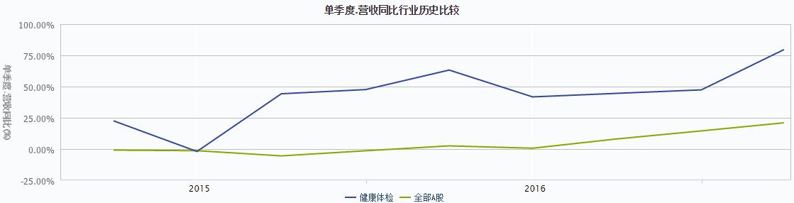 根据图1数据显示,从2015年第一季度到2017年第二季度,与全部A股相比,健康体检行业的单季度营收同比总体处于较高水平,并表现为波动增长的趋势。