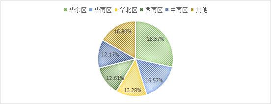 图5、6、7是美年健康的营业收入构成图。按行业分,营业收入中,医疗行业占比99.55%,其他占比0.45%;按产品分,营业收入中,体检服务占比99.25%,其他占比0.25%;按地区分布,营业收入中,华东区、华南区、华北区、西南区、中南区、其他分别占比为28.57%、16.57%、13.28%、12.61%、12.17%、16.80%。