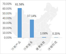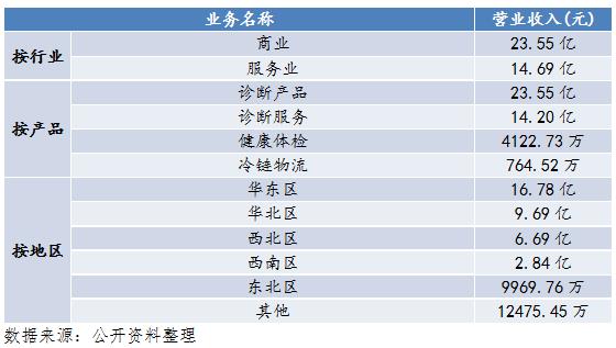 如图9、10、11是迪安诊断的营业收入构成。按行业分,营业收入中,服务业占比38.42%,商业占比61.58%;按产品分,营业收入中,诊断产品占比61.58%,诊断服务占比37.14%,健康体检占比1.08%,冷链物流占比0.20%;按地区分布,营业收入中,华东区、华北区、西北区、西南区、东北区、其他分别占比为43.87%、25.33%、17.50%、7.43%、2.61%、3.26%。