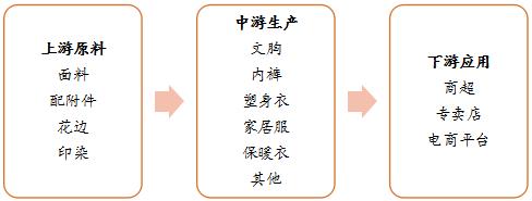 莱卡内衣上游原料主要有面料、附配件、花边、丈根、印染,内衣生产厂将这些原料经过研发设计,生产出相应的内衣产品:文胸、内裤、塑身衣、家居服、保暖衣等。下游终端零售为:商超、专卖店、店商平台。