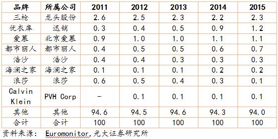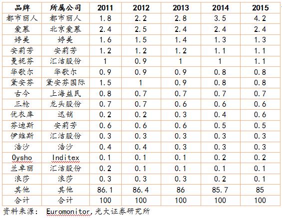内衣作为消费者的第二层“肌肤”,消费者对内衣的消费比其他成衣具备更强的忠诚度,进入 21 世纪后,消费者对内衣品牌的认可也越来越强。 虽然部分品牌由于品牌老化导致市占率降低,但是总体看,前 16 家女士内衣品牌的市场份额从 2011 年的 13.9%提升到了 2015 年的 15%。前八大男士内衣品牌的市占率从 5.4%提升到 6%。