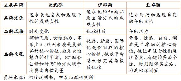 公司实行多品牌运作战略,针对不同年龄段和不同风格的消费者推出三个中高端核心品牌“曼妮芬”、 “伊维斯”和“兰卓丽”,三个副牌COYEEE、Bodybeauty 和乔百仕。其中,主打品牌“曼妮芬”连续 12 年市占率第一,其市占率长期领先于规模最大的内衣公司安莉芳的主品牌“安莉芳”。第二大品牌“伊维斯”连续两年市场份额排名前十。
