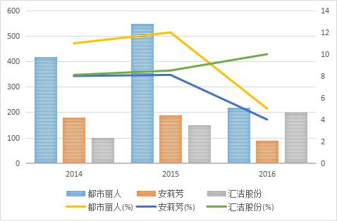 考虑到使用莱卡材料内衣企业主要是中高端企业,企业占市场份额较大,数据可获取等因素,本部分主要针对中高端内衣企业安莉芳集团(以下简称为:安莉芳)、深圳汇洁集团股份有限公司(以下简称为:汇洁股份)、大众性企业广东都市丽人实业有限公司(以下简称:都市丽人)进行分析。