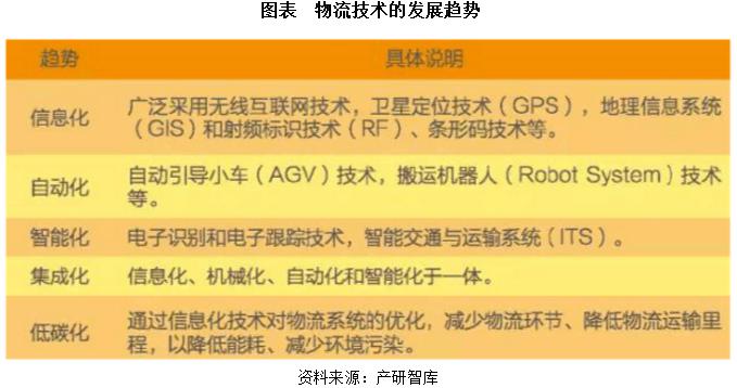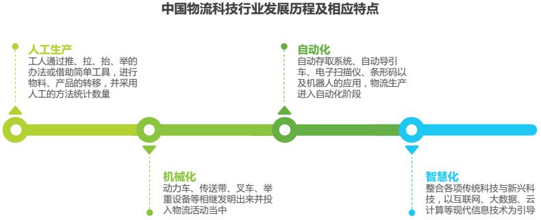 物流业的发展经历了人工生产、机械化、自动化再到智慧化的历程。人工生产的比例逐渐降低,物流作业过程中的设备和设施逐步自动化,但总体上与美国、德国等西方发达国家相比差距较大。工业4.0的提出,强调利用物联信息系统将生产中的供应,制造,销售信息数据化、智慧化,最后达到快速,有效,个性化的产品供应。对于物流科技而言,即整合传统和新兴科技,以互联网、大数据、云计算、物联网等现代信息技术提升物流智能化程度,增强供应链柔性。