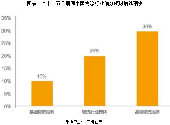 而高端物流服务增速将可以达到30%以上的增长。供应链管理、专业第三方物流和冷链服务等高端业态将迎来快速发展期,考虑到物流行业整体增速可以达到20%以及基础物流服务增速仅在10%左右,预计“十三五”期间高端物流服务将可以迎来年均30%左右的持续增长。