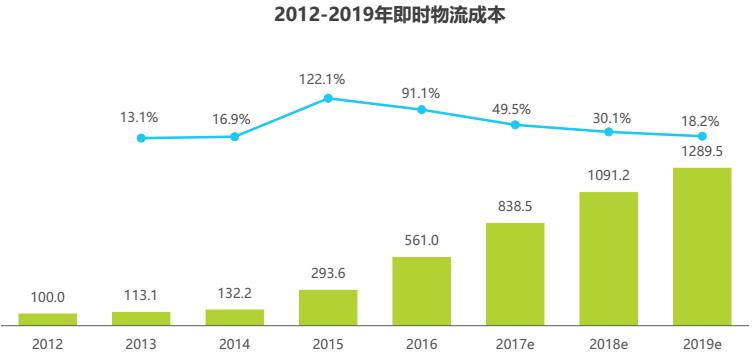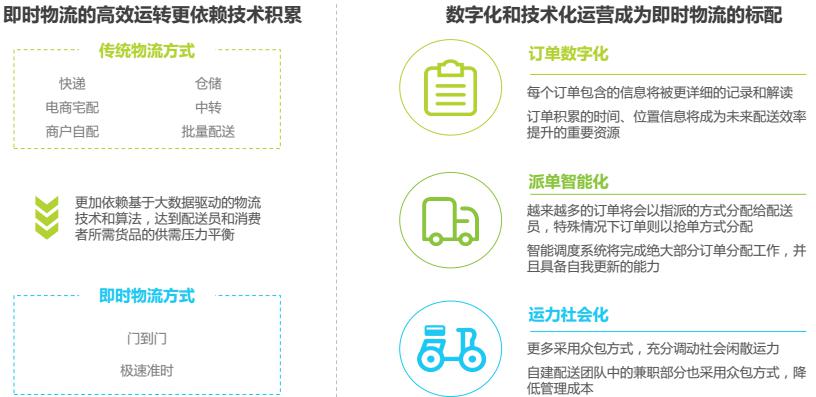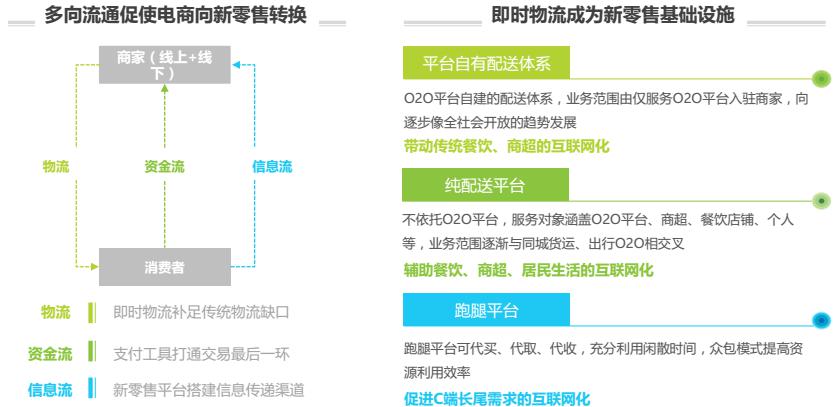 快速、及时、实时的物流实现路径是“新零售” 的必备条件,即时物流在居民生活中扮演着越来越重要的角色,物流能力向下渗透触及居民生活的方方面面,为衣食住行的全方位互联网化提供现实基础,未来新零售趋势下的即时需求比重会逐步增加。