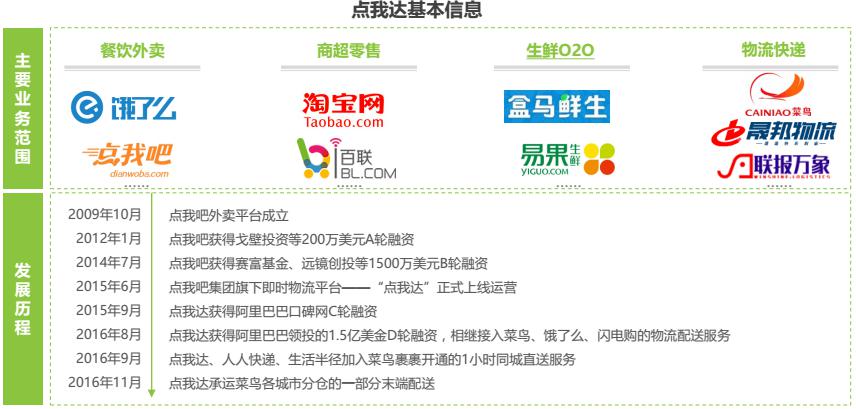 即时物流平台点我达脱胎于外卖平台点我吧,凭借出色的运营和调度能力快速发展。2016年7月,获得阿里领投的1.5亿美金D轮融资,并接入菜鸟网络城市配送体系,成为阿里物流布局战略重点。相较于其他即时物流平台,点我达拥有淘系电商庞大的资源背景作为支撑,订单来源除O2O平台之外还包括物流、电商等,在竞争中占据绝对优势。