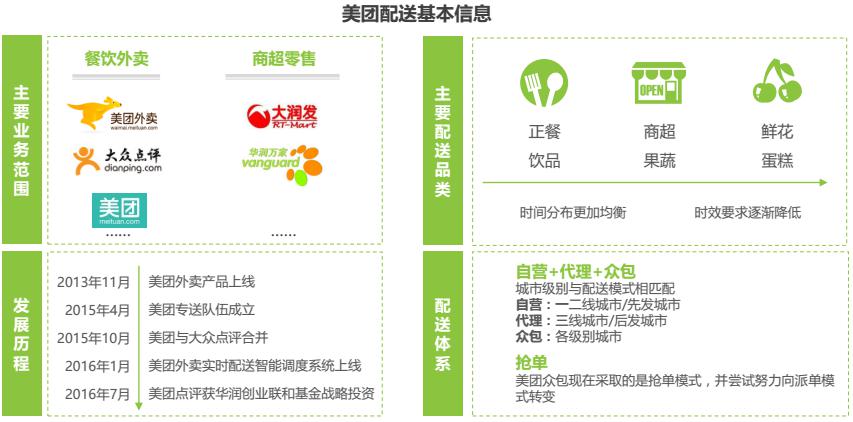 2017年初,美团外卖配送日订单量已经超过900万单,美团配送团队完成的订单比例逐步提升,配送能力日渐增强。基于美团外卖入驻商家类型的多元化,美团配送的品类也在不断扩展。为快速开拓三四线城市的市场,美团外卖采用“自建+加盟代理+众包”的运力组织形式,适应不同市场的需要。
