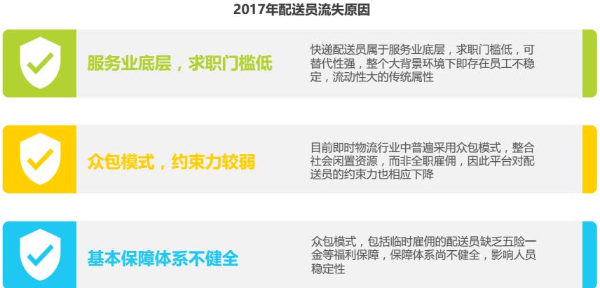 维持稳定的配送员团队,对于配送平台的发展至关重要。但目前即时物流行业存在配送人员流失率高的难题。究其原因,存在以下三方面的因素:求职门槛低、可替代性强,平台对人员的约束力较弱以及基本保障体系不健全。