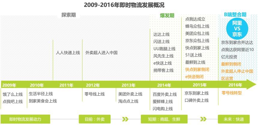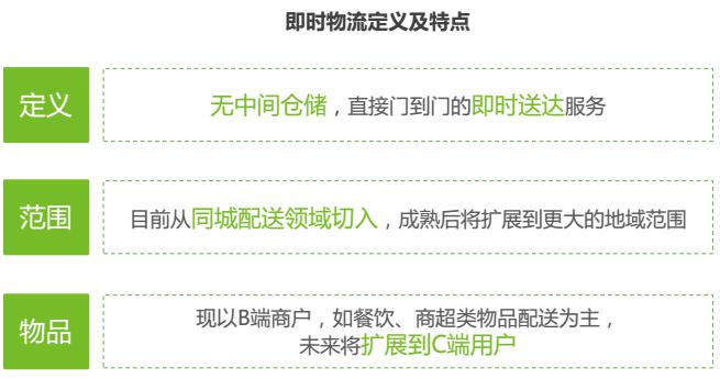 即时物流在餐饮外卖等行业有所涉及。2009年,“即时物流”概念由点我达创始人赵剑锋提出。2016年8月,点我达接受阿里巴巴近10亿元投资,“即时物流”概念广泛传播。2016年11月召开的互联网大会上,美团点评和饿了么相继强调“即时配送”业务。区别于传统物流方式,即时物流的核心特点在于即时性,满足用户提出的极速、准时的配送要求。目前,即时物流以同城、小件领域切入,拓展到生鲜、商超配送领域,再逐步扩展到更为广泛的快递末端领域。