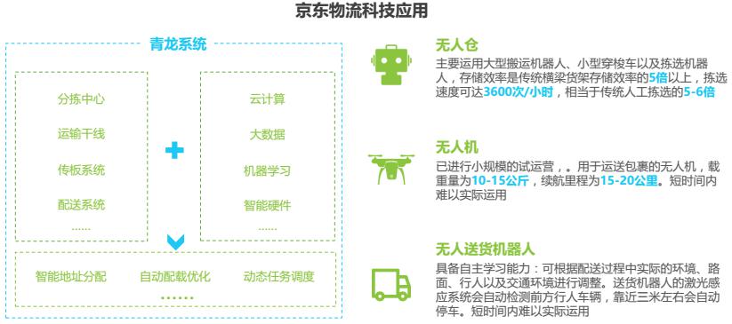 京东于2016年成立了X事业部,专注智慧物流相关技术的研发。2017年4月京东物流宣布独立运营,成立物流子公司。截止2017年6月,京东在全国范围内拥有256个大型仓库,6906个配送站和自提点,包括已经运营了7个大型智能化物流中心“亚洲一号”。目前京东自营配送覆盖了全国98%的人口,压缩商品流通成本70%,提升物流运营效率2倍以上。京东物流科技的应用主要包括两个方面,一是基于大数据预测分析技术实现智能化的调度、决策;二是采用一些更自动化、智能化的设备提升物流效率,最终提升客户的体验。