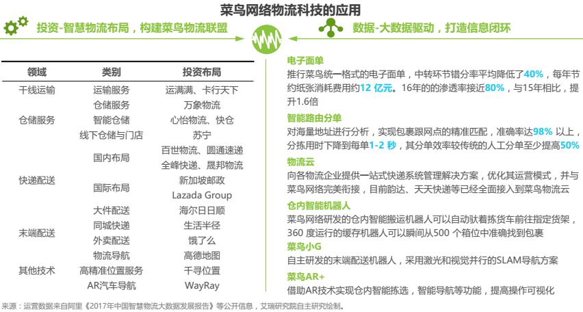 菜鸟网络成立于2013年5月,定位于以数据驱动、社会化协同的物流及供应链平台。主要业务有仓配网络、跨境网络、快递平台和ET.物流实验室,以覆盖全国的仓配网络和大数据决策平台为基础,构建专业高效的供应链服务。为了提高网络效率,一方面菜鸟以投资参股的形式构建菜鸟联盟,另一方面加大科技研发的投入,积极布局智慧物流。